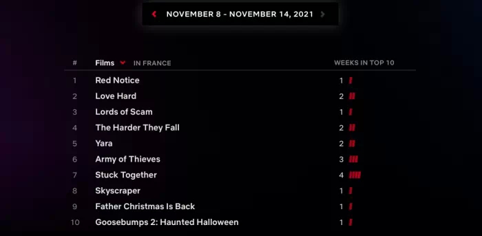 Bien que des précisions auraient été souhaitables vis à vis des différentes catégories et de leurs résultats, ces tops 10 nous permettent néanmoins d'obtenir de nouveaux chiffres de la part de Netflix. Et à en croire ces données, c'est le film Red Notice avec Gal Gadot, Dwayne Johnson et Ryan Reynolds qui domine les classements des films par pays ainsi que celui des films anglophones les plus visionnées.