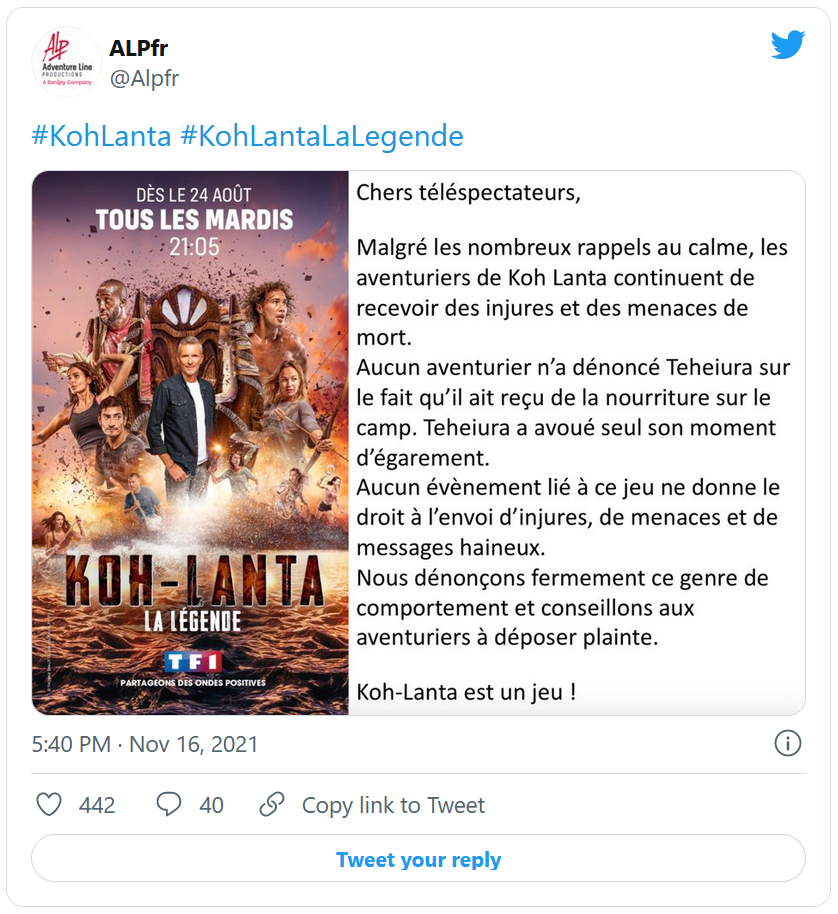 Face à ce manquement aux règles de l'émission, certains candidats ont été pris pour cible par des internautes remontés. Si l'on en croit Adventure Line Productions, des menaces de mort ont même été reçues. Dans un communiqué publié notamment sur Twitter, la production invite les premiers concernés à porter plainte.