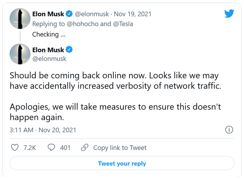 Elon Musk, le directeur général de Tesla, a déclaré hier que l'application mobile de l'entreprise était de nouveau en ligne après la panne des serveurs de l'application. Musk répondait au tweet d'un propriétaire de Tesla résidant à Séoul en Corée du Sud, qui avait déclaré rencontrer une "erreur de serveur 500" en tentant de connecter son Model 3 via l'application iOS.