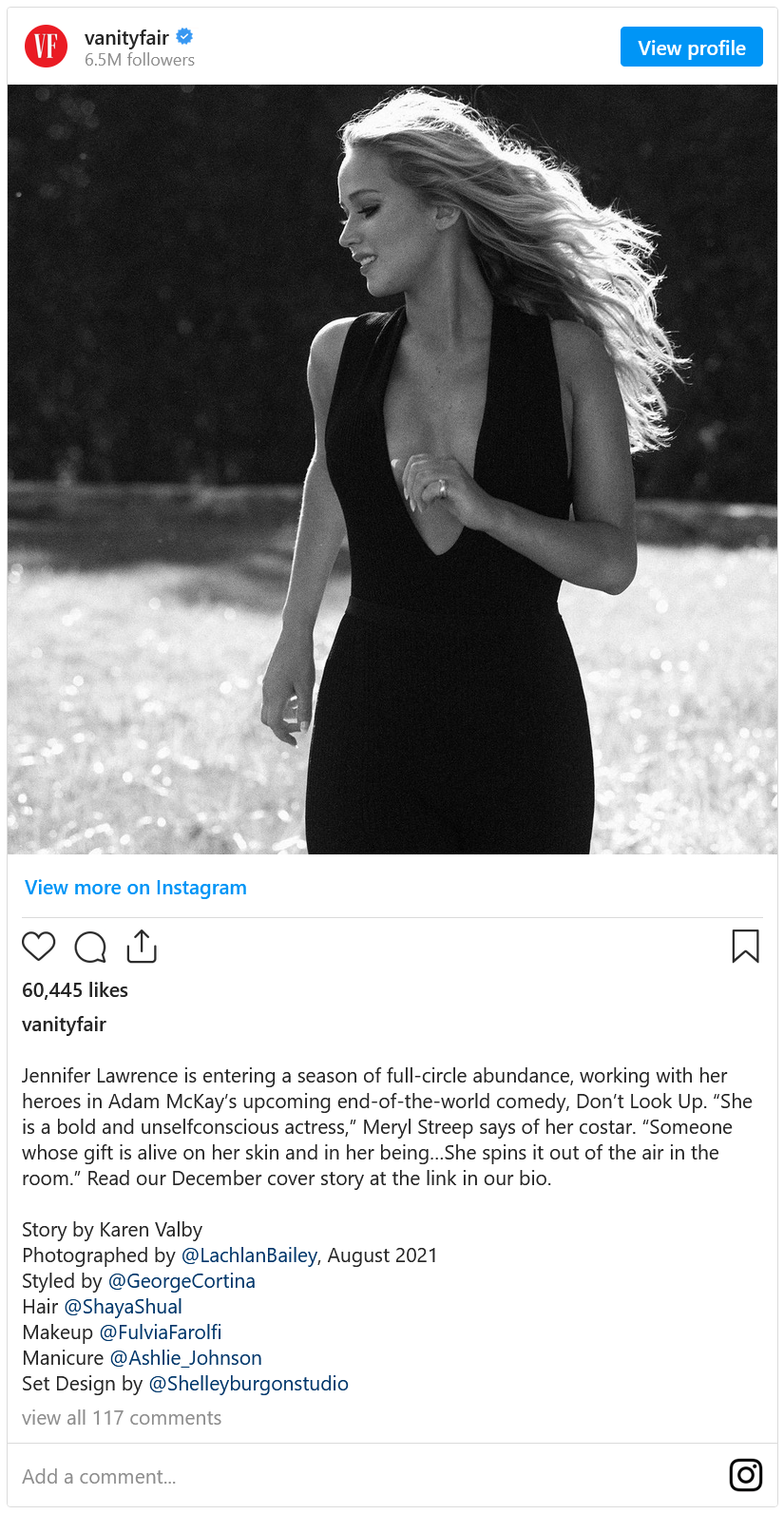 On apprend dans cette interview que lorsque Jennifer Lawrence avait à peine 20 ans, elle espérait pouvoir travailler un jour avec Adam McKay (The Big Short), obsédée par les comédies de Will Ferrell. Et dix ans plus tard, l'actrice parvient à réaliser son rêve, en incarnant un rôle principal dans le prochain film de McKay Don't Look Up : Déni Cosmique aux côtés de Leonardo DiCaprio, Meryl Streep, Cate Blanchett et Jonah Hill, disponible à partir du 24 décembre sur Netflix.