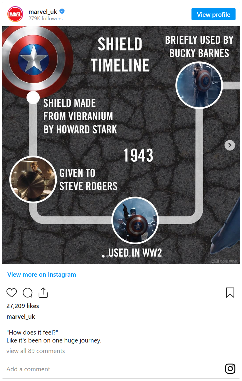 Ainsi, comme vous pouvez le découvrir dans la publication du compte Instagram Marvel UK & Ireland, la chronologie complète du bouclier en vibranium débute par sa création en 1943 par Howard Stark. Il est ensuite confié à Steve Rogers qui va l'utiliser pendant la Seconde Guerre mondiale avant d'être brièvement utilisé par Bucky Barnes.