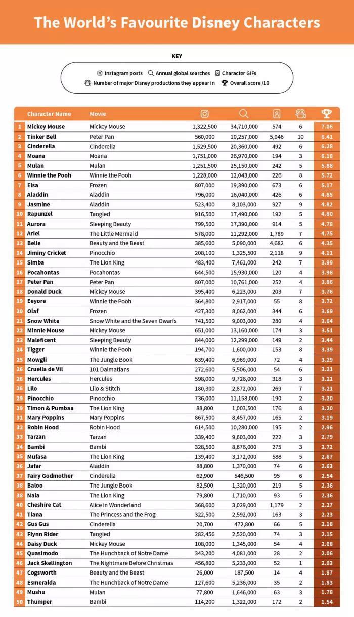 Bon, on se demande si elle ne s'est pas faite pistonner par ses grands patrons, mais la souris Mickey est bel et bien le personnages le plus mentionné et recherché par les internautes, arrivant en tête du classement dans 38 pays. Peut-être moins attendue, la fée clochette la talonne, éclipsant au passage son ami Peter-Pan et ce en n'ayant pourtant pas prononcé le moindre mot dans le film original. Cendrillon, Vaiana et Mulan (la plus populaire chez nous) viennent compléter le top 5 de ce classement Disney.