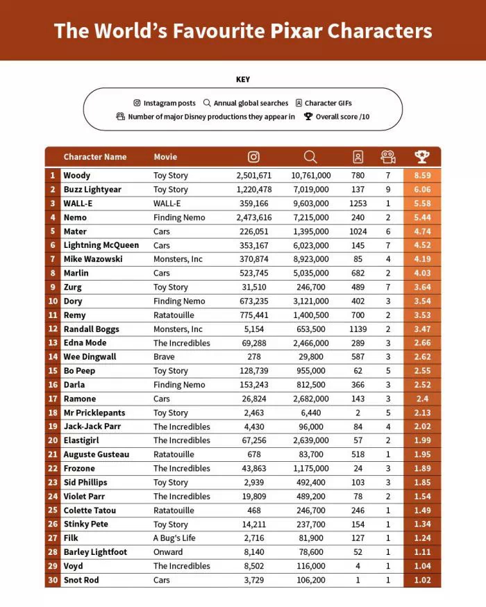 Pour plus d'informations sur les 80 personnages classés et leurs chiffres détaillés, on vous invite à consulter les tableaux ci-dessous (crédits : Poundtoy). Sachez néanmoins que Woody est le personnage le plus à la mode, mentionné sur Instagram plus de 2,5 millions de fois. Mickey Mouse est quant à lui le plus recherché sur Google avec ses 34,7 millions de mentions. La fée clochette, enfin, remporte à la fois la palme du personnage au plus grand nombre de gifs (6 000) et celle du personnage apparaissant dans le plus de films d'animation (10) !