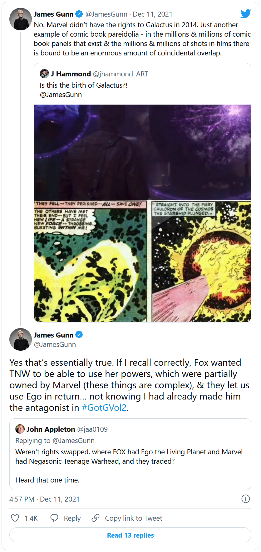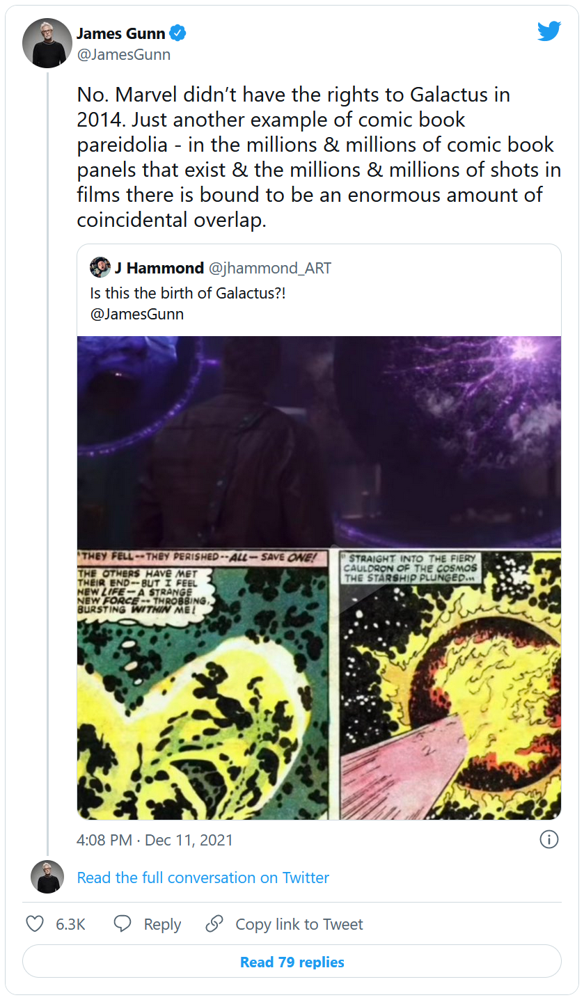 James Gunn : 'Non. Marvel n'avait pas les droits de Galactus en 2014. Encore un exemple de paréidolie des comics - dans les millions et millions de planches de comics qui existent et les millions et millions de plans dans les films, il y a forcément une énorme quantité de chevauchements fortuits.'