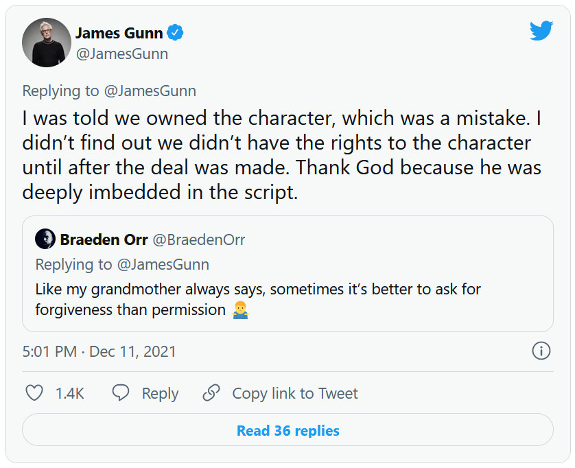 James Gunn : 'On m'a dit que le personnage nous appartenait, ce qui était une erreur. Je n'ai découvert que nous n'avions pas les droits sur le personnage qu'après avoir conclu l'accord. Dieu merci, car il était profondément ancré dans le scénario.'