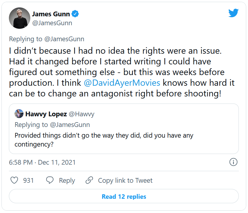 James Gunn : 'Je n'en avait pas parce que je ne savais pas que les droits étaient un problème. Si cela avait changé avant que je commence à écrire, j'aurais pu trouver une autre solution, mais c'était des semaines avant la production. Je pense que David Ayer sait combien il peut être difficile de changer un antagoniste juste avant le tournage !'