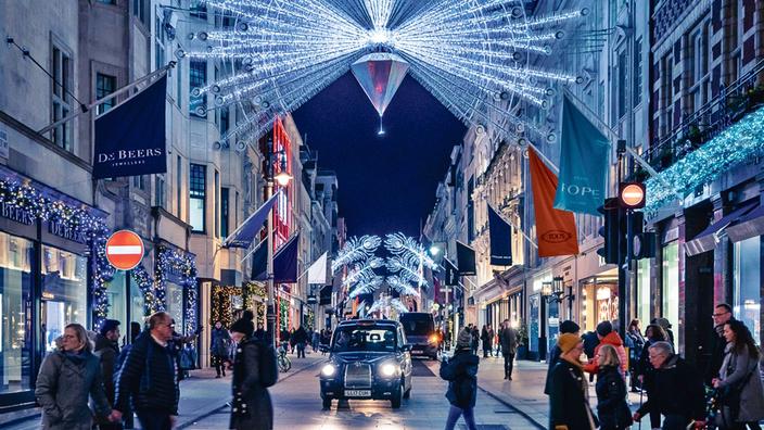 Rien, ni le Covid ni le Brexit, ne semble pouvoir l'entamer. Tel un cadeau géant, l'immeuble Cartier est emballé d'un gros nœud de néons rouges ; la façade de Ralph Lauren, habillée de dizaines de sapins et de couronnes scintillantes. Un serpent de lumière rampe sur la devanture de Bulgari, une résille multicolore éclaire les murs de Stella McCartney, une lune et des nuages azuréens nimbent la maison Tiffany & Co... Sans oublier les décorations publiques en forme de flocons géants et de plumes de paon qui brillent au centre de l'artère. Tous ces décors majestueux ravissent les visiteurs et s'avèrent ultra-photogéniques sur Instagram.