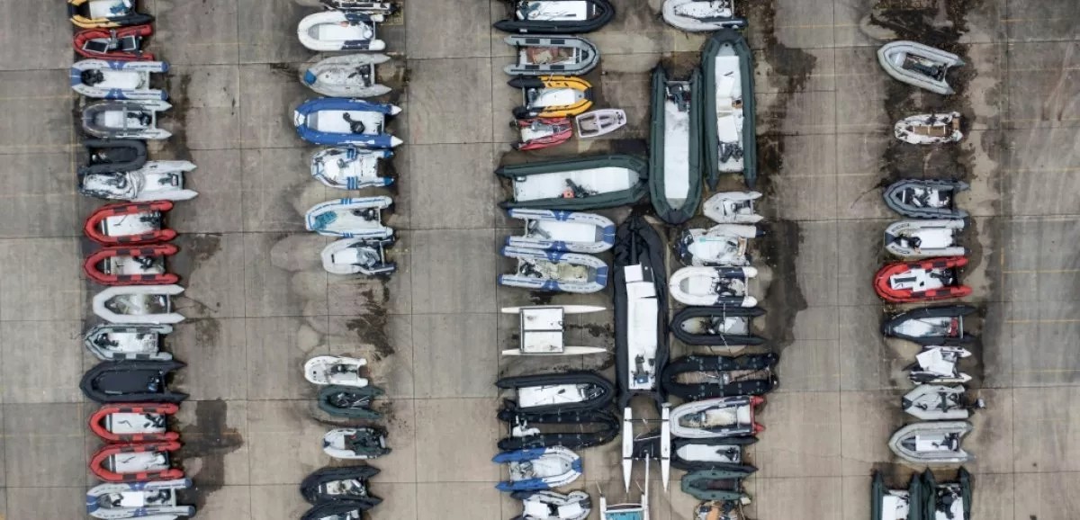 Vue aérienne de canots pneumatiques ayant été utilisés par des migrants, stockés dans le port de Douvres, dans le sud-est de l'Angleterre, le 21 décembre 2021.