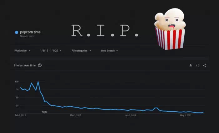 Mardi 4 janvier dernier, le groupe a annoncé sa fermeture. La note d'adieu de Popcorn Time était illustrée d'un sac de maïs soufflé, logo du site, avec des yeux en forme de X pour symboliser sa mort.