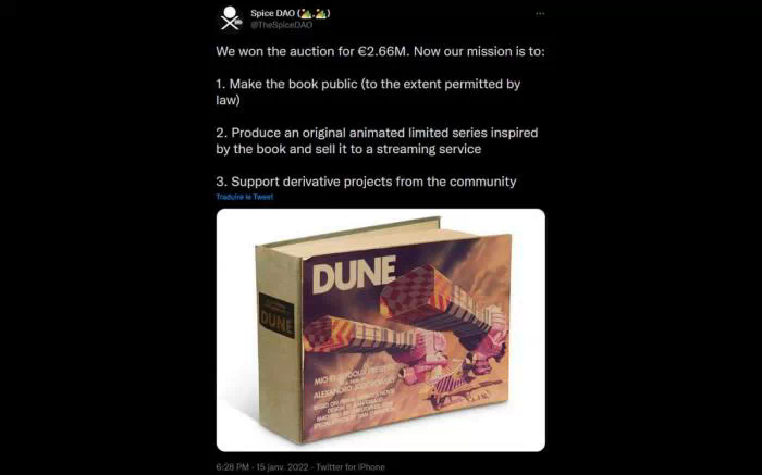Un collectif crypto appelé Spice DAO a eu la bonne idée de se lancer dans l'acquisition du livre Dune. Ce dernier est très rare, et le collectif a dépensé la modique somme de 2,6 millions d'euros pour acheter le fameux livre. Le but de cette entreprise, selon leurs propres termes, est de rendre le livre public, de produire une série limitée animée de l'originale inspirée du livre et la vendre à un service de streaming, et enfin de soutenir les projets dérivés de la communauté.