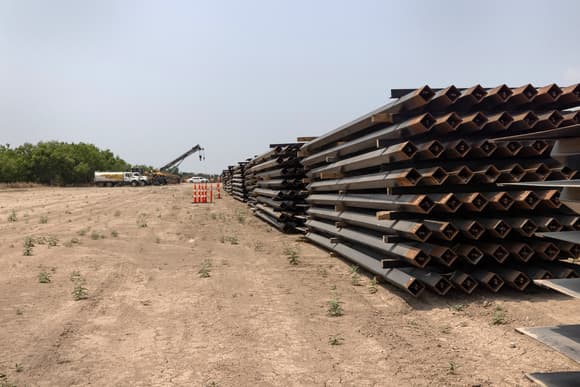 Des poteaux en acier inutilisés reposent près d'une partie du mur frontalier inachevé à la frontière entre les États-Unis et le Mexique, le 14 avril 2021 à La Joya (Texas).