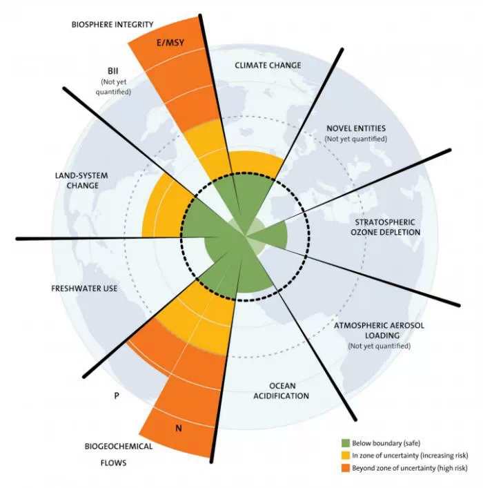 Le concept des limites planétaires a été illustré en 2009 par un groupe de scientifiques internationaux afin de mesurer l'impact de différents facteurs sur la stabilité de notre planète. Ce concept a été matérialisé par un camembert, découpé en 9 parts, où chacune représente une catégorie et un taux d'incidence. Parmi elles on retrouve par exemple le Changement climatique, l'Acidification des océans, l'utilisation d'eau douce, ou encore la diminution de la couche d'ozone stratosphérique. Si 4 d'entre-elles ont déjà été franchies, la 5ème (introduction d'entités nouvelles dans la biosphère) vient désormais dresser ce bilan : plus de la moitié du camembert a déjà été entamé.