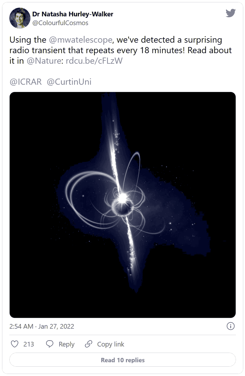 L'objet observé par les astronomes australiens, situé à environ 4 000 années-lumière de la Terre, serait particulièrement brillant et disposerait d'un champ magnétique puissant, qu'il serait capable de convertir en ondes radio, et ce bien plus efficacement que tous les autres objets découverts jusque-là. Car sa grande particularité réside en effet dans son émission d'un rayonnement électromagnétique important et régulier (dont la perception par le télescope MWA est illustrée ci-dessous), trois fois par heure et pouvant durer jusqu'à une minute. Pour être plus précis, ce rayonnement se répète toutes les 18,18 minutes : "une périodicité inhabituelle qui, à notre connaissance, n'a pas été observée auparavant", peut-on lire dans la publication de Nature.