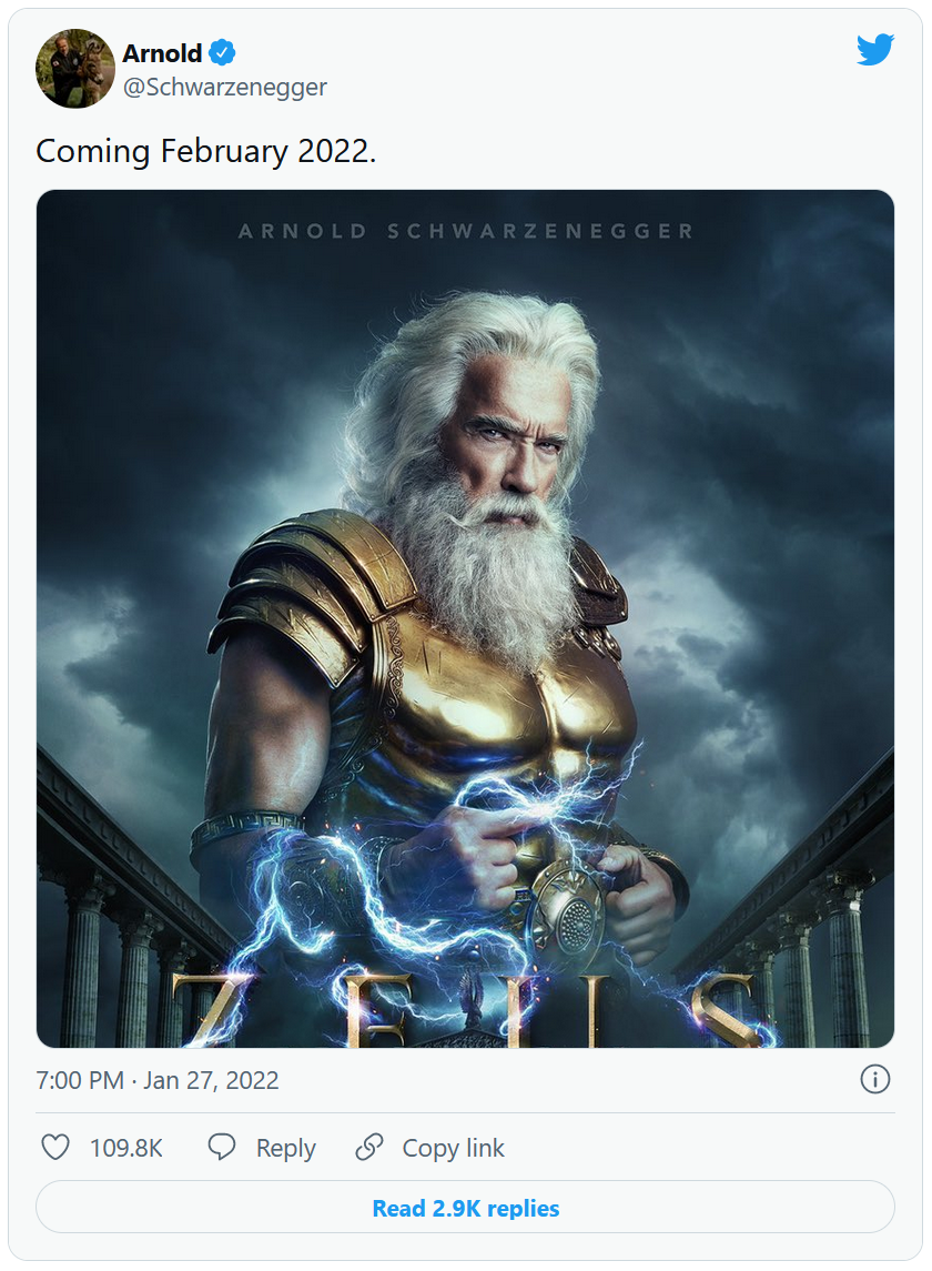 En effet, Arnold Schwarzenegger a publié sur son compte Twitter, une photo de lui grimé en un dieu grec mythique. Comme vous pouvez le voir sur la publication que nous vous partageons ci-dessous, l'acteur est déguisé en Zeus, le dieu du ciel et du tonnerre le tout accompagné de la légende "A venir en février 2022".