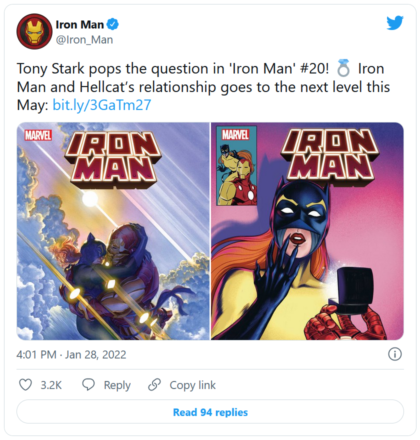Patsy Walker, aussi connue sous le nom de Hellcat, s'est avérée être une bonne partenaire pour l'industriel alors qu'il s'adaptait à ses nouveaux pouvoirs cosmiques. Après une épreuve harassante face à des conflits inter-dimensionnels massifs, Tony Stark a retrouvé un peu de calme. Et tout porte à croire qu'il vivra très bientôt un mariage dans les comics Marvel, mais le bonheur sera-t-il au rendez-vous pour les deux héros ?