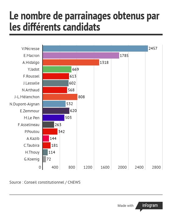 Ils sont les neuvième, dixième et onzième candidats à récolter leurs 500 parrainages, après Emmanuel Macron (La République en Marche), Valérie Pécresse (Les Républicains), Anne Hidalgo (Parti Socialiste), Yannick Jadot (Europe Ecologie Les Verts), Fabien Roussel (Parti communiste), Jean Lassalle (Résistons), Nathalie Arthaud (Lutte ouvrière) et Jean-Luc Mélenchon (La France Insoumise).