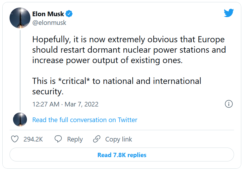 Néanmoins, aucune preuve réelle d'un tel acte n'a pu être actuellement rapportée, si ce n'est selon un communiqué de presse de SolarCity, que Tesla a acquis en 2016. On ne sait pas si Elon Musk tiendra parole, mais toujours est-il qu'il se manifeste régulièrement sur Twitter face à la flambée des prix du baril de pétrole et la nécessité de trouver des alternatives. Son intervention, liée à la relance des centrales en Europe, intervient deux jours après qu'il ai préconisé une augmentation de la production américaine de pétrole et de gaz pour contrer toute baisse des approvisionnements russes.