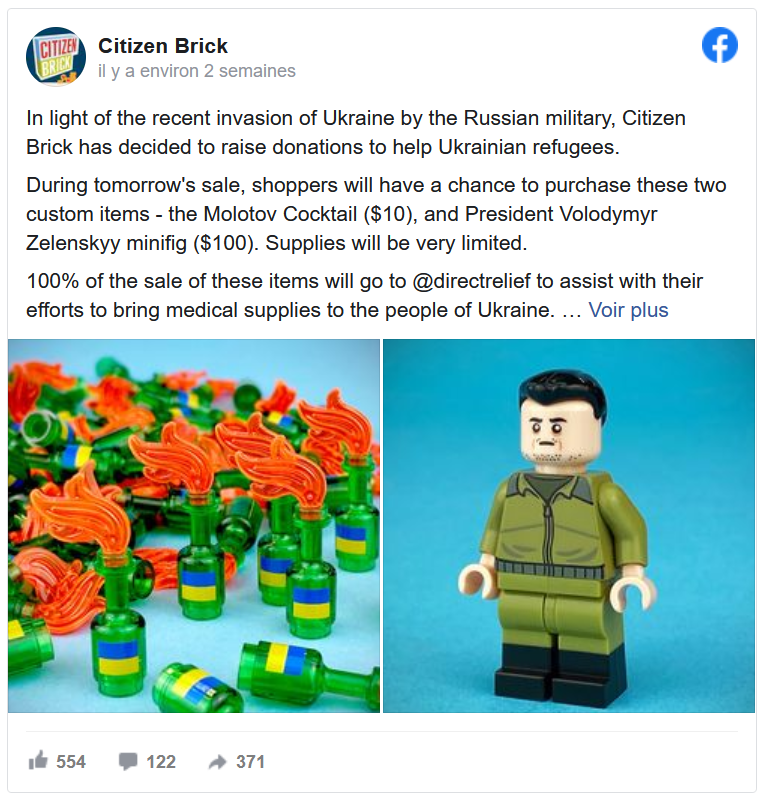Pour 10 $, les acheteurs les plus rapides pouvaient faire l'acquisition de la petite figurine cocktail Molotov, marquée du drapeau ukrainien. Quant à la figurine de Volodymyr Zelensky elle était disponible pour la modique somme de 100 $. L'intégralité des recettes sont reversées directement à Direct Relief, une organisation humanitaire actuellement active en Ukraine, mais également dans une cinquantaine d'autres pays. Ce week-end, les figurines étaient déjà en rupture de stock, et LEGO a pu récolter plus de 16 000 $ uniquement grâce aux ventes.