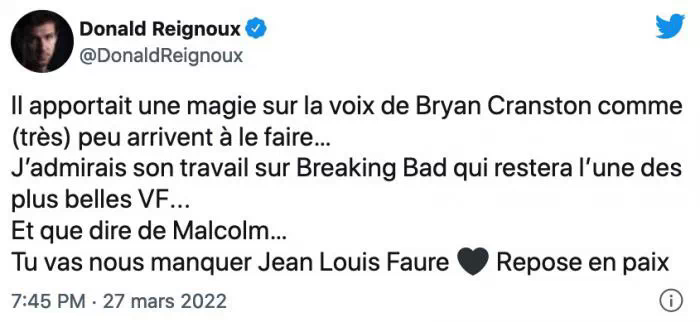 Si vous avez regardé la sitcom Malcolm ou si vous êtes fans de Breaking Bad, alors vous avez déjà entendu la voix de Jean-Louis Faure. C'est le comédien qui prêtait sa voix à l'acteur américain Bryan Cranston et il vient malheureusement de nous quitter.