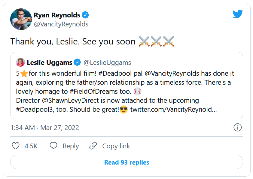 Pas de doute possible quant à l'apparition de Leslie Uggams dans Deadpool 3 surtout avec trois katanas croisés en émoji insérés dans le tweet de Reynolds faisant référence à son personnage.