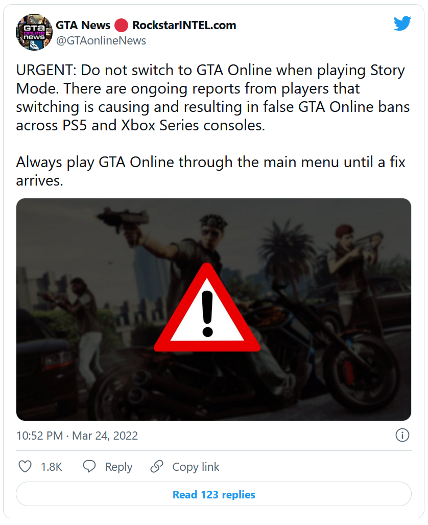 Une information partagée par Rockstar Intel, un site spécialisé dans tout ce qui touche de près ou de loin à Rockstar. Et comme l'explique le tweet ci-dessus, ce bannissement définitif intervient lorsque les joueurs passent directement du mode Histoire au mode en ligne. Suite à un bug particulier, cette manipulation entraîne une fausse restriction résultant en un ban définitif. Pour contourner le problème, tous les joueurs sont invités à accéder à GTA Online uniquement via le menu principal du jeu.