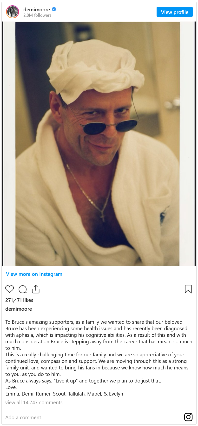 À tous les merveilleux admirateurs de Bruce, nous voulions vous annoncer, en tant que famille, que notre bien-aimé Bruce a eu quelques problèmes de santé, et qu'on lui a récemment diagnostiqué une aphasie, qui impacte ses capacités cognitives. Il en résulte, qu'après mûre réflexion, Bruce met fin à sa carrière, qui comptait pourtant tellement pour lui.