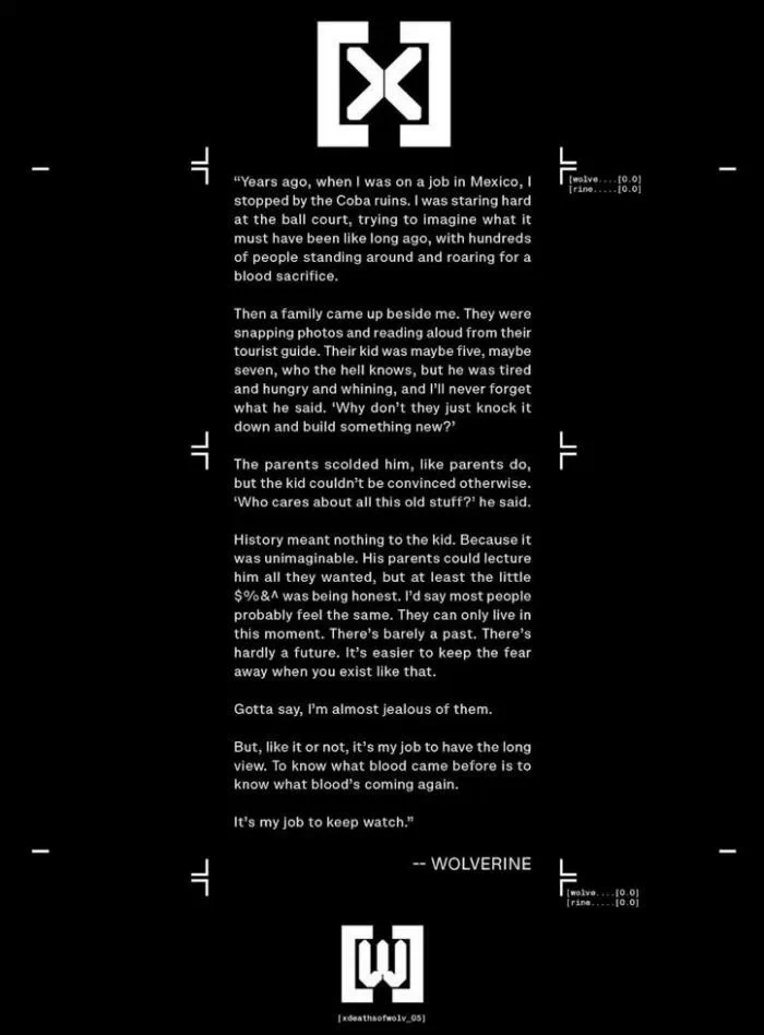 Une entité qui lui octroie des pouvoirs incroyables mais difficiles à contenir. Jean Grey, malgré son fort potentiel, ne parvient pas à lui résister. Et par le passé, Wolverine a déjà refusé catégoriquement de lui servir d'hôte. Seulement, il semblerait désormais qu'un variant de Logan ait finalement abdiqué. Pourquoi ? Wolverine n'est pourtant pas du genre à accepter qu'une entité cosmique prenne possession de son corps. Logan préférerait sans doute mourir que de laisser son corps aux mains de la Force Phénix. Les lecteurs ont donc eu du mal à comprendre comment un Wolverine pouvait être l'hôte le plus ancien de cet entité. Les fans curieux de savoir pourquoi Wolverine embrasserait soudainement un pouvoir qu'il a rejeté n'ont pas besoin de chercher plus loin qu'un texte dans X Lives of Wolverine #5. Une réponse qui se trouve dans une page de texte apportée par X Deaths of Wolverine #5.