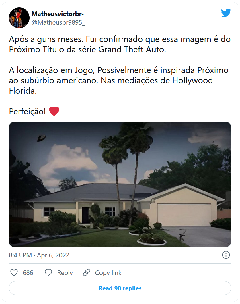 Cette maison, où deux palmiers trônent fièrement, semble provenir d'un état au climat tropical. On pense à la Californie ou à la Floride, et plus particulièrement aux villes de San Andreas et de Vice City. Davantage, un utilisateur de Twitter a apparemment découvert que la source de l'image provenait d'une maison réelle dans le comté de Palm Beach, en Floride.
