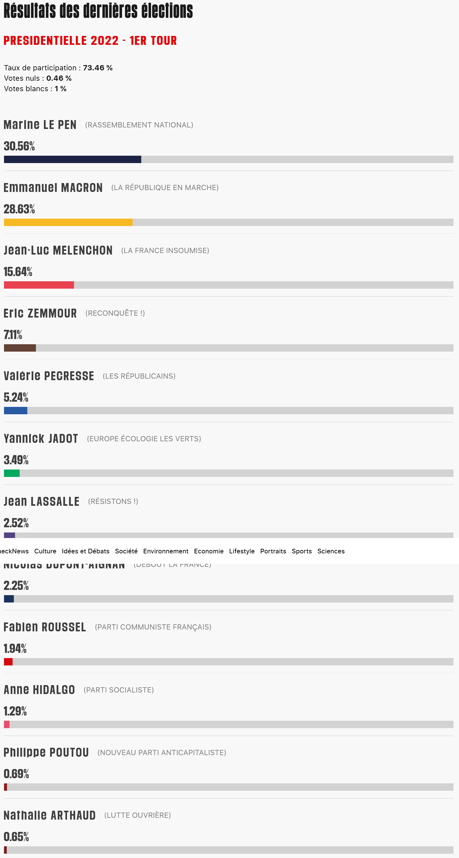 Département Marne : consultez les résultats de l'élection présidentielle 2022 et le nombre de suffrages obtenu par chaque candidat. A l'issue du premier tour, Marine LE PEN arrive en tête du scrutin avec 30.56 % des suffrages. Emmanuel MACRON obtient 28.63 % des voix. Suivent respectivement Jean-Luc MÉLENCHON (15.64 %), Éric ZEMMOUR (7.11 %) et Valérie PÉCRESSE avec 5.24 % des votes. Le taux de participation s'élève à 73.46 %. Retrouvez les résultats complets des autres candidats au premier tour de la présidentielle avant le second tour de l'élection, le 24 avril.