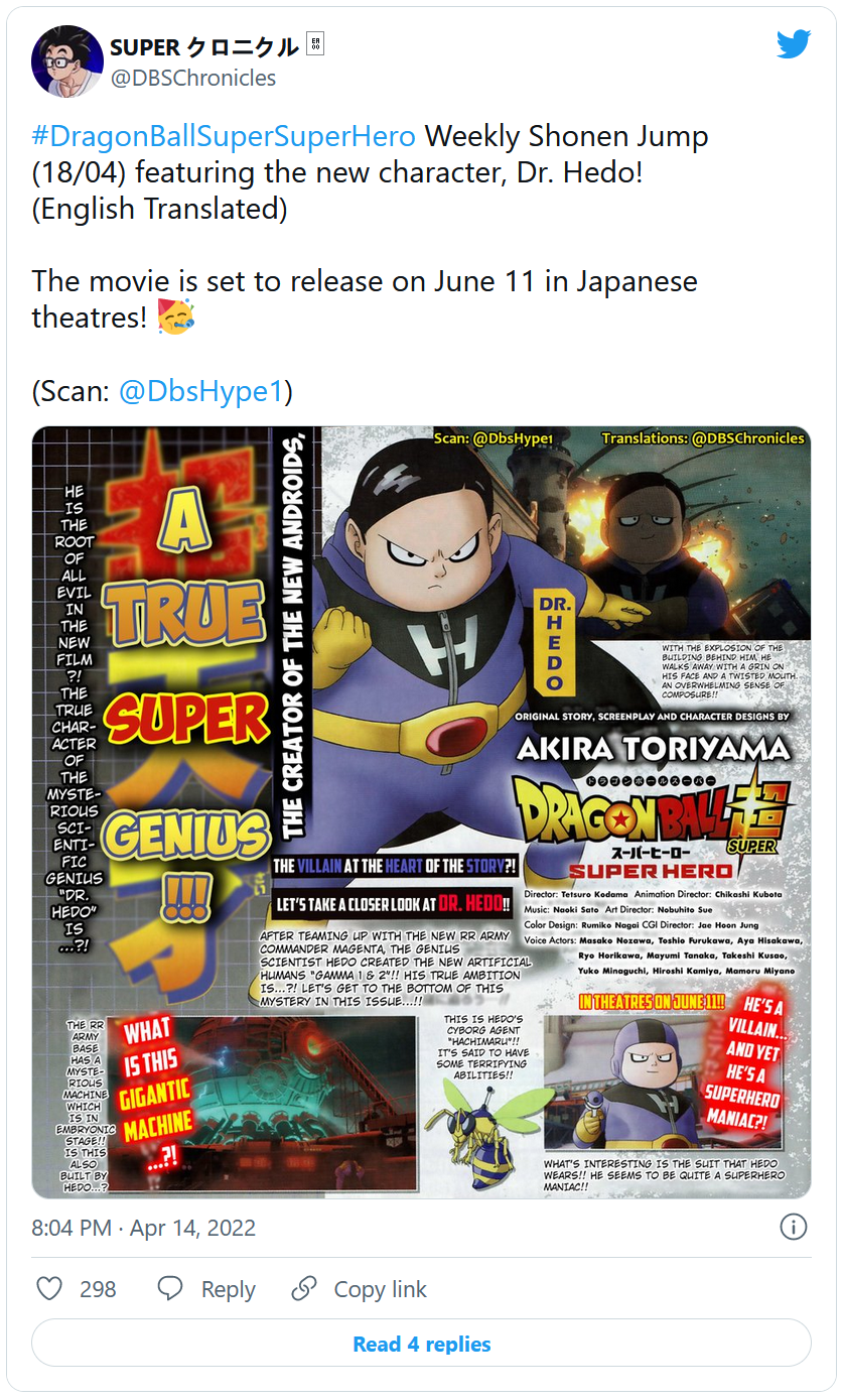 Ces nouvelles informations proviennent d'un article spécial paru dans le dernier numéro du Weekly Shonen Jump, qui a été scanné et partagé en ligne par DBSHype et DBSChronicles sur Twitter. Bien que le Dr. Hedo ne soit pas le chef de l'Armée du Ruban Rouge nouvellement ressuscitée, le magazine le qualifie comme étant "la racine de tout le mal dans le nouveau film".