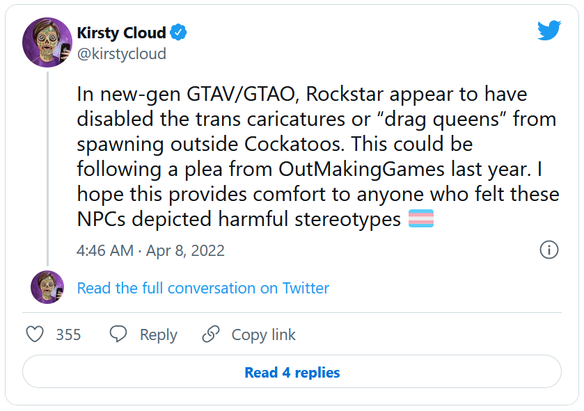 Kristy Cloud, une administratrice du site GTANet, a également fait remarquer sur Twitter que les "caricatures trans" qui apparaissaient normalement autour de la boîte de nuit appelée le Cockatoos ont également été retirées. Si les personnages semblent toujours accessibles avec le Director Mode, leurs options de dialogue ont été désactivées.