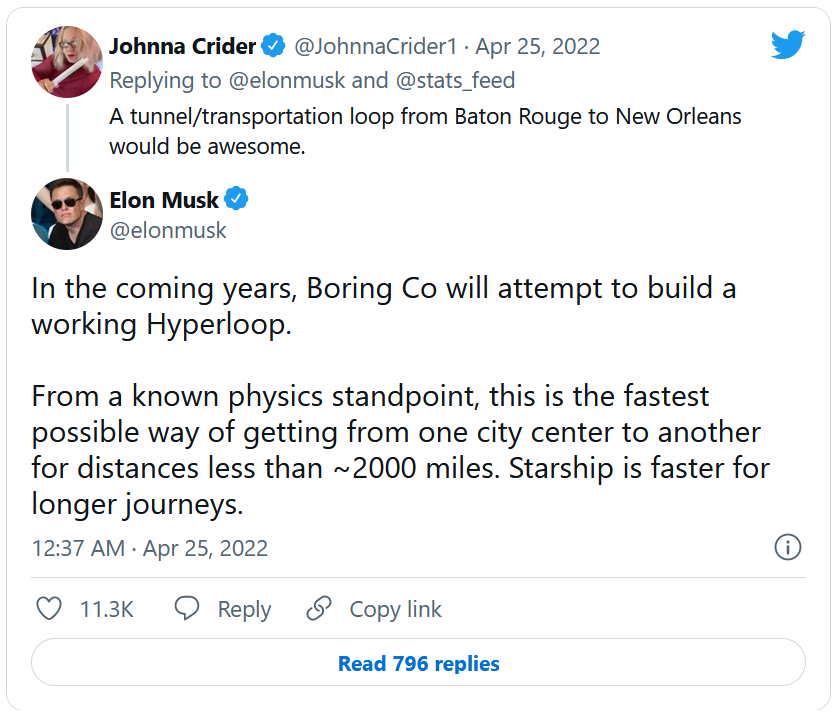 Du point de vue de la physique connue, c'est le moyen le plus rapide de se rendre d'un centre-ville à un autre lorsque la distance distance est inférieure à 2 000 milles (un peu plus de 3 000 kilomètres, ndlr). Le Starship est plus rapide pour les voyages plus longs.