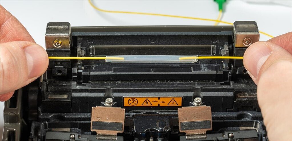 Ensuite, les deux fibres à relier ensemble sont mises dans une soudeuse qui va placer face à face leurs cœurs (ils ne mesurent que 9 microns) puis procéder à une soudure à l'arc électrique. Il faut évidemment faire cette opération pour chaque fibre à la fois. Ensuite, le technicien place au-dessus de l'épissure (le point de jonction) un « smoove » qu'il fait préalablement glisser sur l'un des deux bouts de la fibre (avant de les souder évidemment) et faire le rétreint.