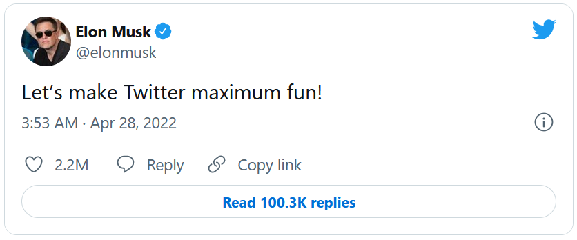 Vous n'avez pas pu passer à côté de cette information ces derniers jours : Elon Musk a bel et bien racheté Twitter, pour la modique somme de 44 milliards de dollars. Selon lui, il ne s'agirait nullement d'une lubie mais d'un acte totalement réfléchi, aux multiples objectifs, parmi lesquels favoriser la liberté d'expression. Mais continuer à troller tout le monde à tort et à travers semble également en faire partie.