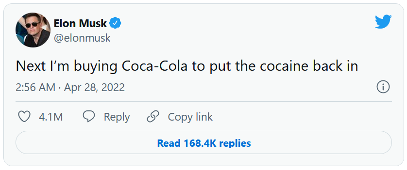 Comme si le rachat de Twitter par Elon Musk n'avait pas déjà assez fait parler comme ça, le milliardaire a publié un tweet étonnant tout récemment, dans lequel il évoque sa volonté de racheter Coca-Cola "pour y remettre de la cocaïne", puisque le fameux psychotrope était bel et bien présent dans la boisson jusqu'au début du XXe siècle.