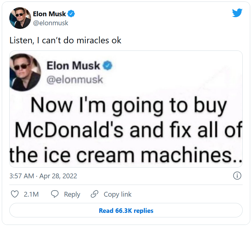 Vous l'aurez compris, il s'agit évidemment d'un gros troll de la part d'Elon Musk, qui s'amuse probablement de toutes les personnes ayant critiqué son rachat de Twitter. Enfin... On imagine. Dans le cas contraire, cela serait tout de même un peu gros : quelques heures plus tard, le milliardaire a partagé le screenshot d'un ancien tweet à lui, dans lequel il évoquait le rachat de McDonald's, pour pouvoir "réparer toutes les machines à glace".