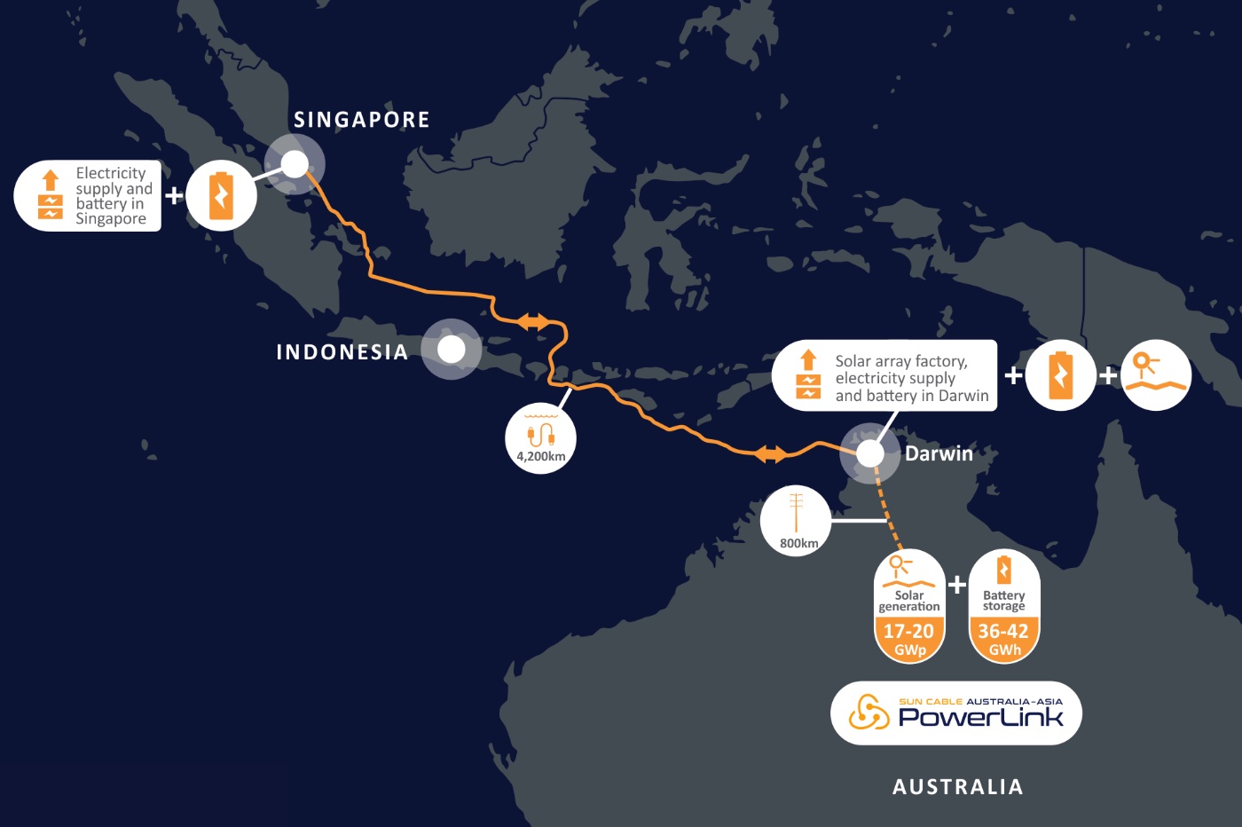 Une partie de l'énergie produite par cette ferme solaire est destinée à Singapour, et pour relier ces deux parties du monde distantes de plus de 5.000 km, un câble sous-marin va être tiré. C'est un projet énorme à 22 milliards de dollars, mais indispensable si Singapour veut respecter ses objectifs de réduction de carbone. Le parc australien doit fournir 3,2 gigawatts d'électricité solaire à la cité-État, soit 15 % de l'énergie consommée par la ville.