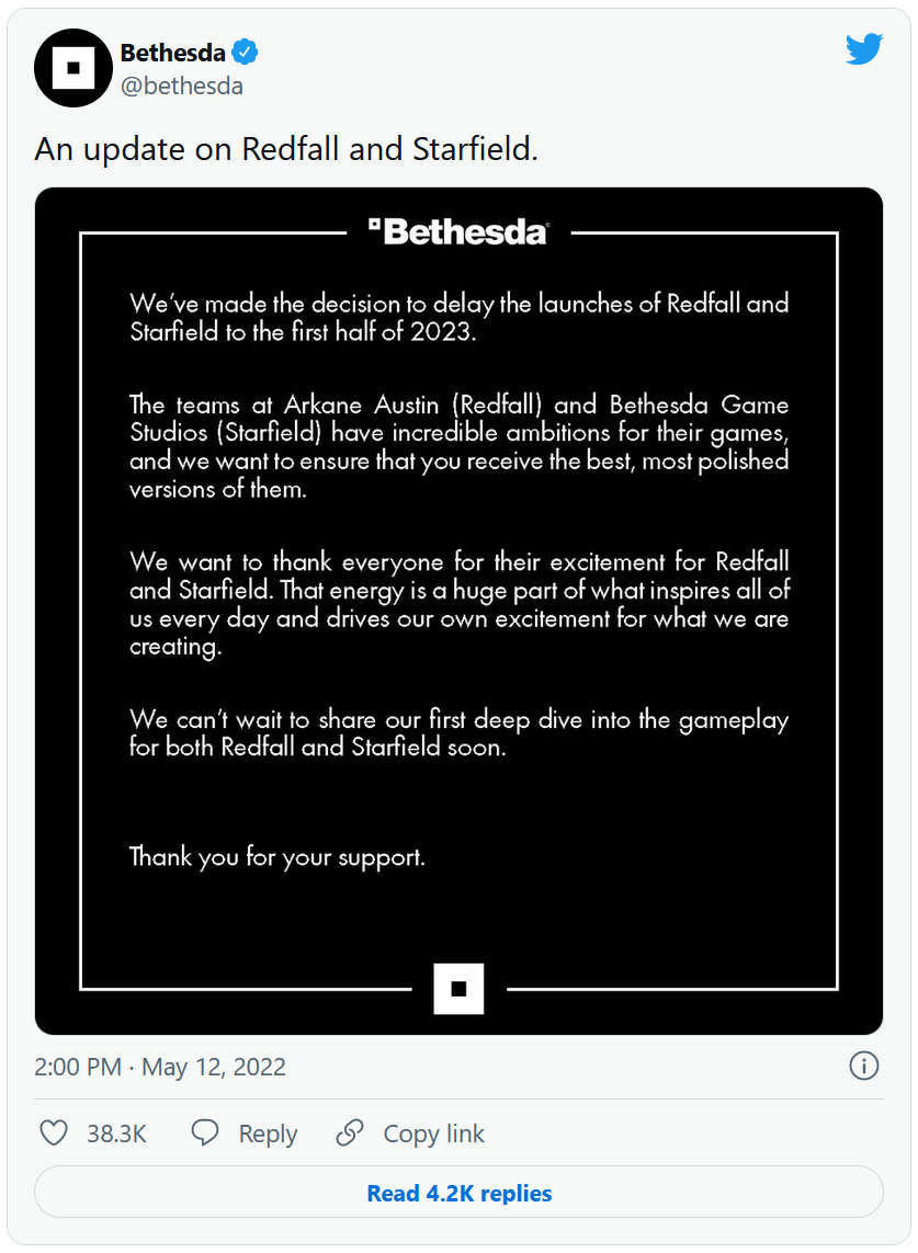 Nous avons pris la décision de retarder la sortie de Redfall et Starfield au premier semestre 2023.