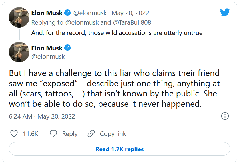 La victime aurait refusé, mais en aurait subi les conséquences par la suite en voyant son temps de travail considérablement réduit, ce qu'elle aurait perçu comme une forme de représailles. Choquée après cet incident, elle aurait par la suite décidé de porter plainte auprès des ressources humaines, qui n'auraient pas donné suite. Finalement, les choses se seraient retournées contre elle lorsque SpaceX aurait fait appel à un médiateur afin de régler la situation, débouchant sur l'accord de licenciement à 250 000 $ évoqué plus haut. De son côté Elon Musk s'est évidemment exprimé sur Twitter afin de réfuter ces "accusations totalement fausses". Il s'est même permis de lancer un "défi" à la victime présumée afin de vérifier la véracité de ses propos :