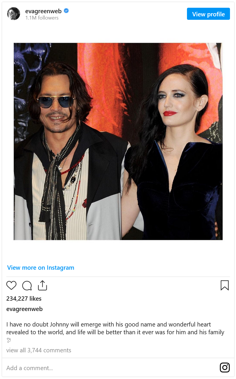 Ce jeudi 19 mai, la comédienne Eva Green a publié une photo de Johnny Depp et d'elle sur son compte Instagram, pour apporter son soutient à la star de Pirates des Caraïbes. Elle a accompagné cette image d'une légende où elle exprime son profond soutient à Johnny Depp :
