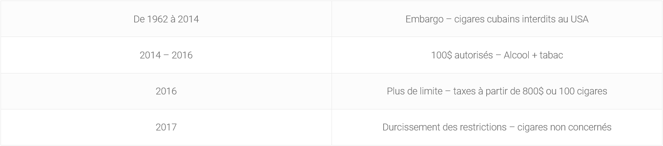 Jusque-là les douanes américaines appliquaient une tolérance zéro, et ce même si les cigares étaient achetés dans un autre pays que Cuba. Impossible donc pour les américains d'acheter des cubains à Londres ou à Paris.