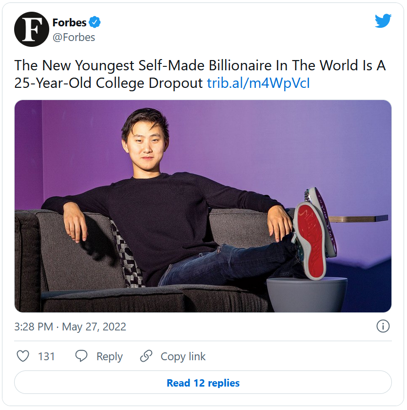 Le nouveau plus jeune milliardaire autodidacte du monde est un étudiant de 25 ans qui a abandonné ses études.