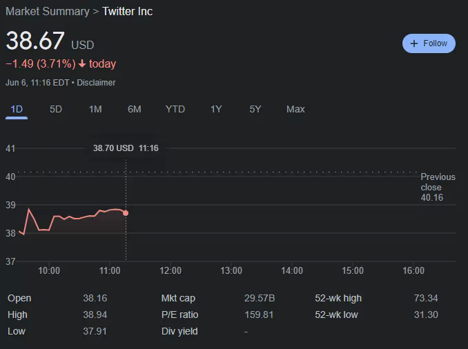 Et comme le rapporte CNBC, l'action de Twitter avait chuté de 5% ce lundi matin. Pour rappel, Musk avait écrit sur Twitter le mois dernier que son rachat de la société, fixé à 44 milliards de dollars, n'avancerait pas tant qu'il n'aurait pas plus d'informations sur le nombre de faux comptes sur la plateforme. Et certains analystes avaient alors interprété ce geste comme étant une tactique de négociation destinée à faire baisser le prix de rachat.