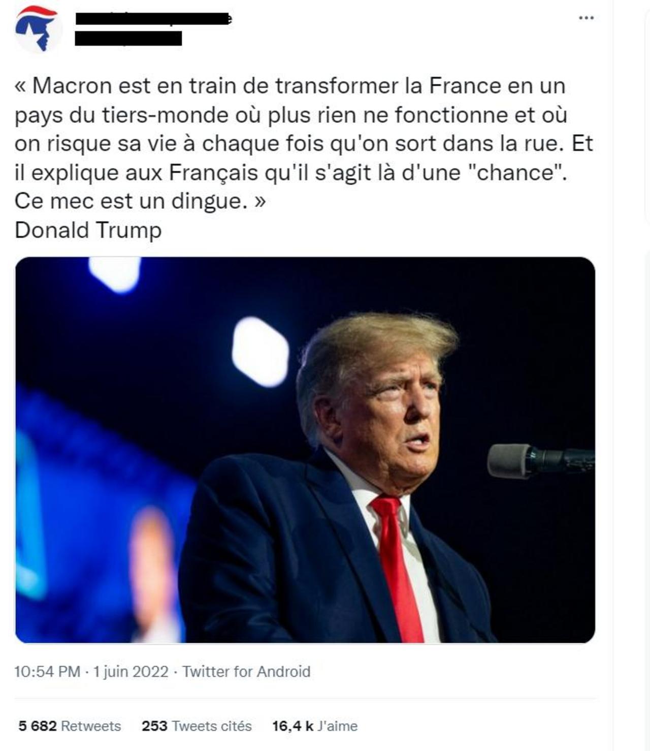 Entre guillemets, ce compte suivi par 49.200 personnes écrit : "Macron est en train de transformer la France en un pays du tiers-monde où plus rien ne fonctionne et où on risque sa vie à chaque fois qu'on sort dans la rue. Et il explique aux Français qu'il s'agit là d'une 'chance'. Ce mec est un dingue." Une attaque virulente, signée "Donald Trump" et partagé près de 6000 fois. Sauf que cette citation est introuvable.