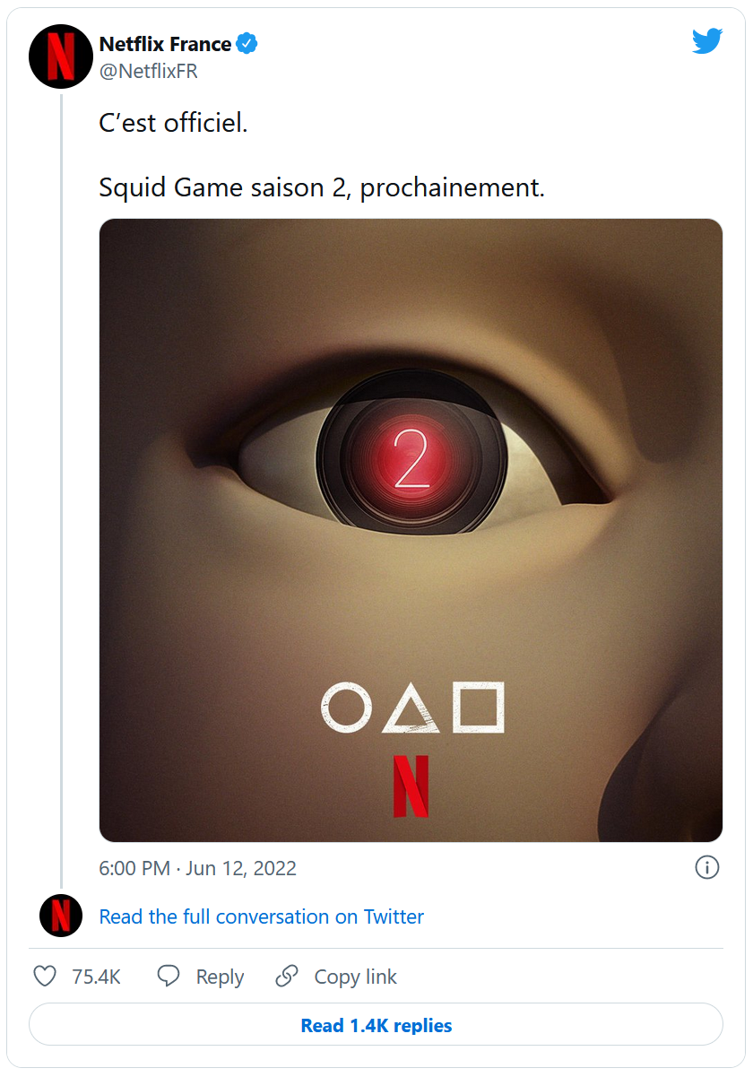 En effet, Netflix vient de donner son accord pour la saison 2 de Squid Game. La plateforme a publié ce dimanche 12 juin un tweet annonçant la bonne nouvelle aux fans.