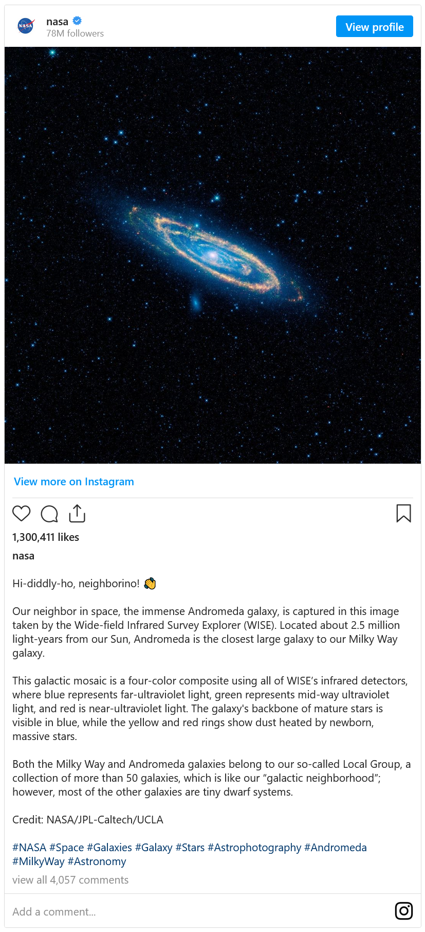 La photographie est accompagnée d'un message explicatif de la NASA, apportant des détails sur la galaxie d'Andromède et sur la photo en question. Voici l'intégralité de leurs précisions ci-dessous :
