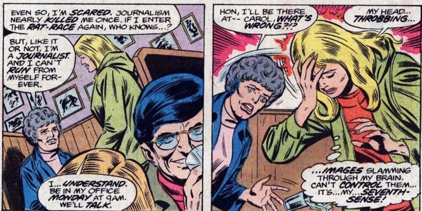 Étant sensible aux flux des énergies cosmiques ambiantes, cela lui confère une certaine forme de perceptions sensorielles nettement améliorées. Elle a ainsi développer une sorte de conscience cosmique lui permettant de sentir le danger avant même qu'une crise ne commence, comme un don de prémonition. C'est ce qu'on a appelé le "septième sens". Lorsqu'elle conservait des personnalités multiples, ce don l'incitait à se transformer en Miss Marvel.