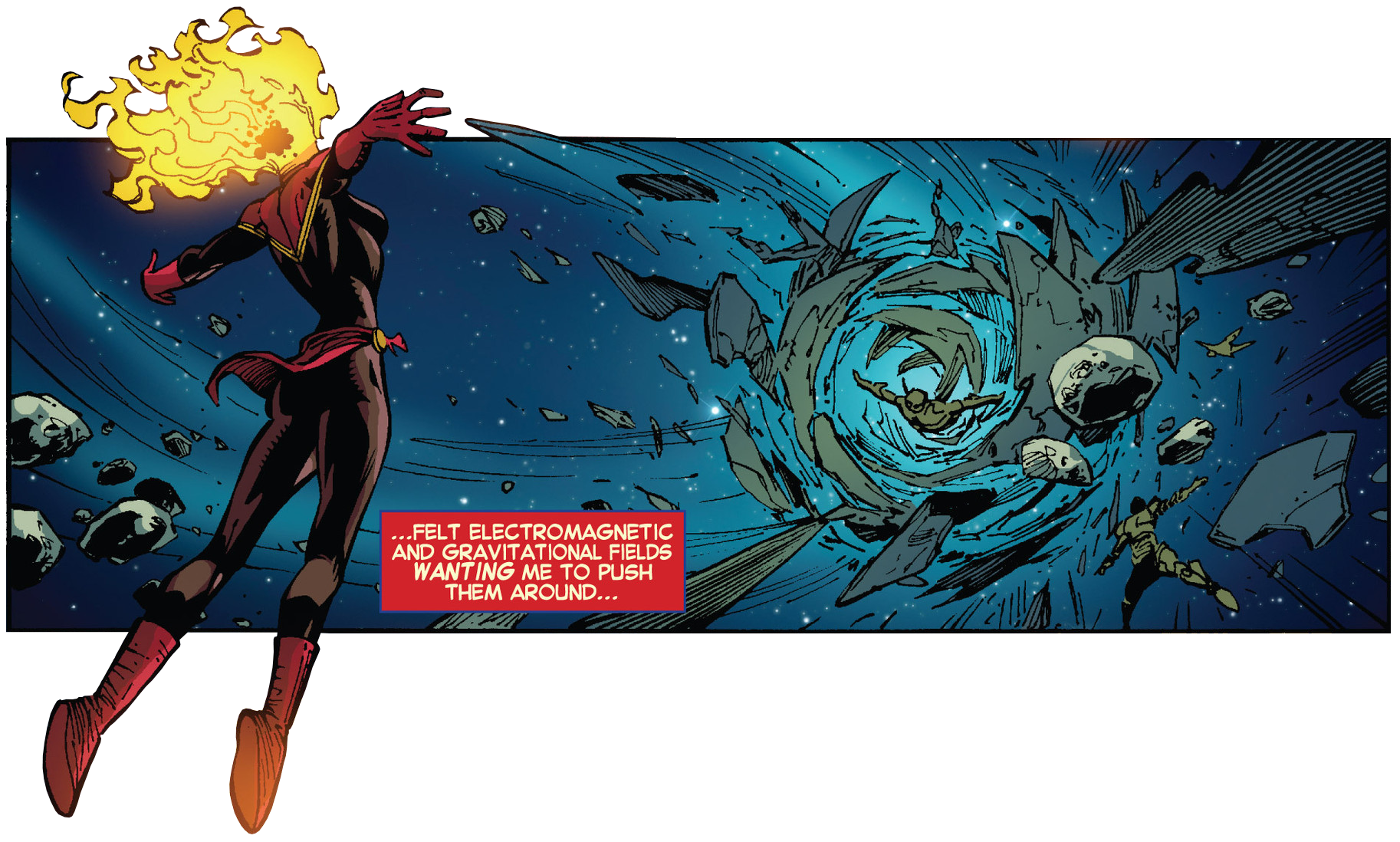 La transformation de Carol Danvers en Binaire lui a permis d'augmenter au maximum toutes ses capacités de Miss Marvel, mais le fait est que de nouvelles aptitudes se manifestaient à mesure que ses pouvoirs se renforçaient. Et outre son aptitude à émettre de la chaleur, de la lumière et même l'ensemble du spectre électromagnétique, elle était aussi capable d'émettre des ondes de gravité.