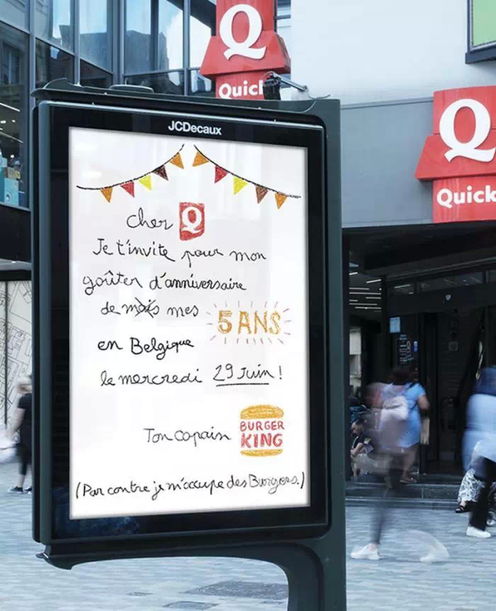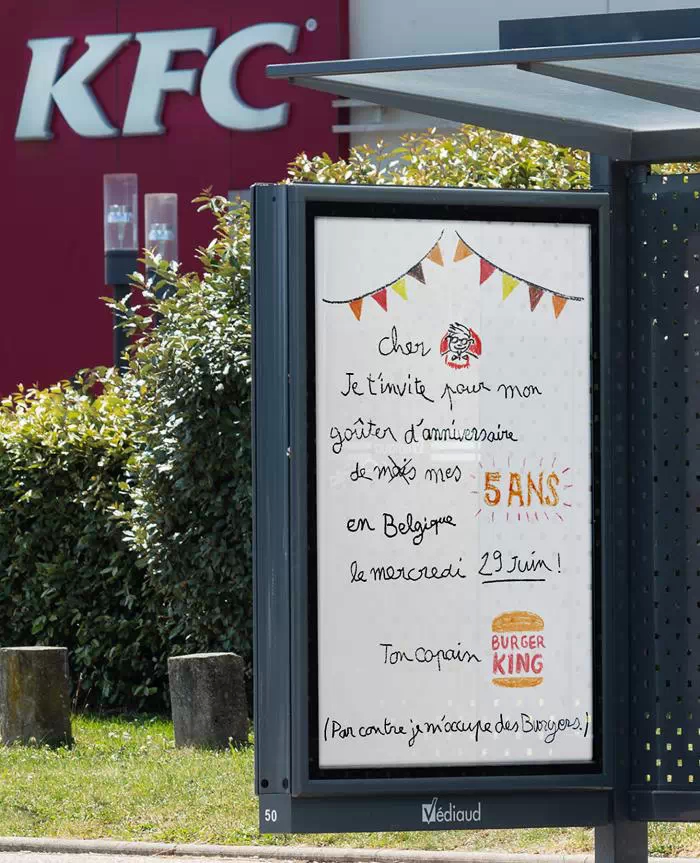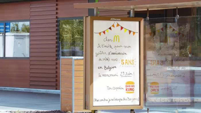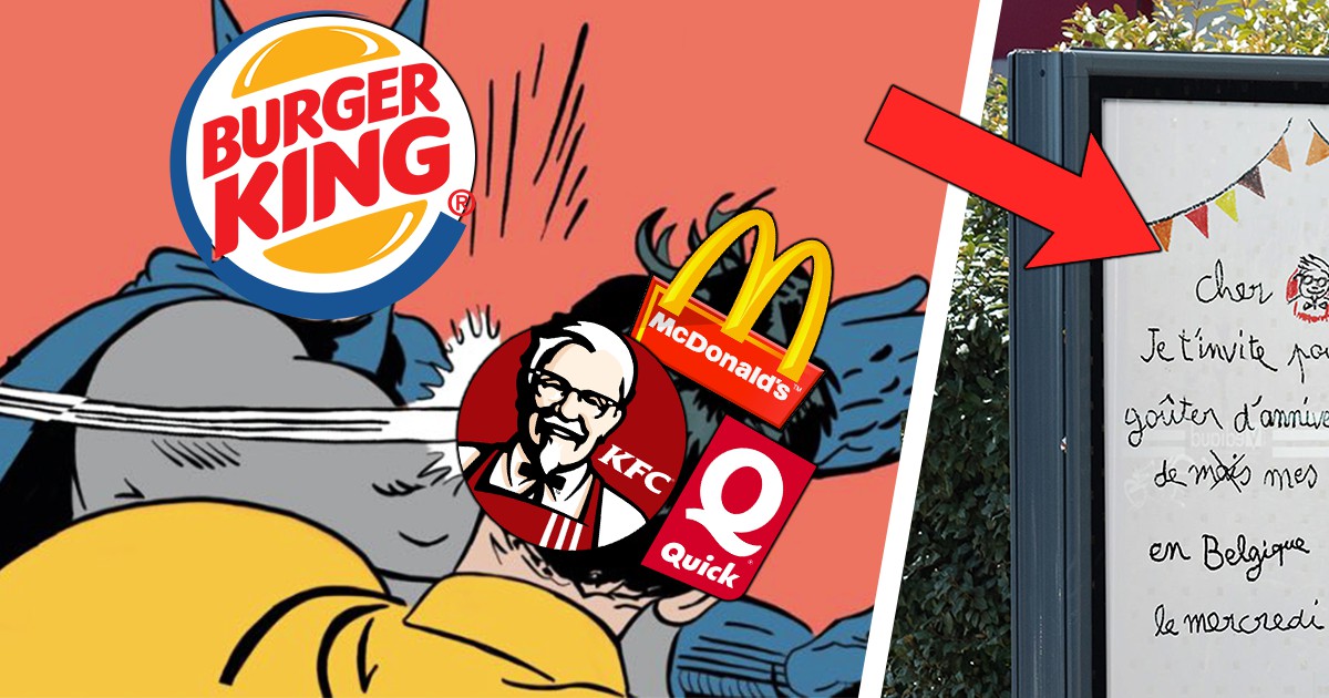 La nouvelle campagne publicitaire marquante de Burger King prend place en Belgique en ce moment même. L'enseigne invite en effet les trois autres gros géants du fastfood, McDonald's, Quick et KFC, à un goûter d'anniversaire pour fêter ses 5 ans d'existence dans le pays. l'agence Buzzman, qui a réalisé la campagne dont il est question ici, a posté toutes les affiches présentes devant la concurrence.