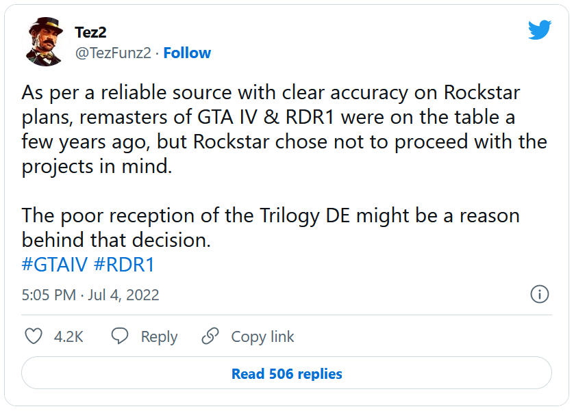 Cependant, une nouvelle information affirme que ces remasters ne sont plus en cours de réalisation. Tez, sur Twitter, est considéré depuis longtemps comme un initié fiable de chez Rockstar. Et ce dernier vient de déclarer que les plans de Rockstar pour les remasters de GTA 4 et Red Dead Redemption ne sont désormais plus envisagés.